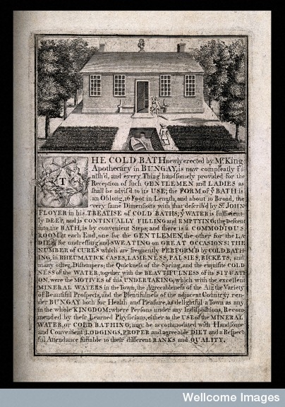 On August 16 2012 I appeared on Channel 4’s Restoration Man as an expert on the eighteenth-century vogue for cold bathing as a healthy activity with George Clarke. One of the defining features of contemporary western society is its obsession with health fads, whether in the form of macrobiotic diets or ‘sweating it out’ in the gym. However, this is an age-old concern and in 18th-century Britain the health craze of the day resulted in the creation of plunge pools and cold baths in houses and gardens across the land. These containers filled with cold water could be located within the main house or within a purpose-built structure set in the landscape, such as a grotto, where they often formed part of a circuit of garden features to be inspected. Although they were often aesthetically pleasing, their main purpose was to help facilitate a healthy way of life, and their placement, particularly when they formed part of a designed landscape, was as important in terms of encouraging good health as a dip in the cold water itself.